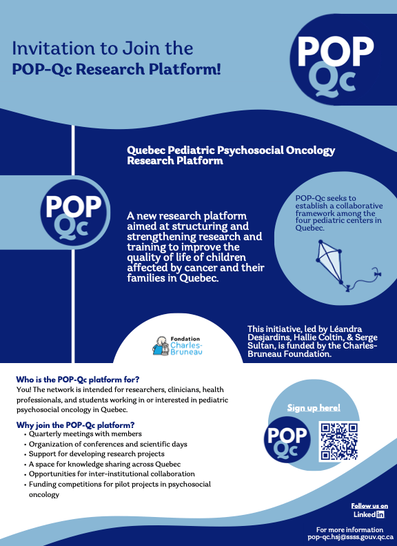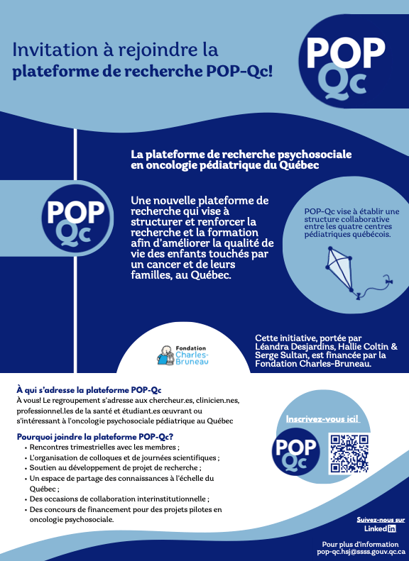 - Plateforme de recherche psychosociale en oncologie pédiatrique du Québec (POP-Qc)/Quebec Pediatric Psychosocial Oncology Research Platform (POP-Qc) (see attached in French and English)
