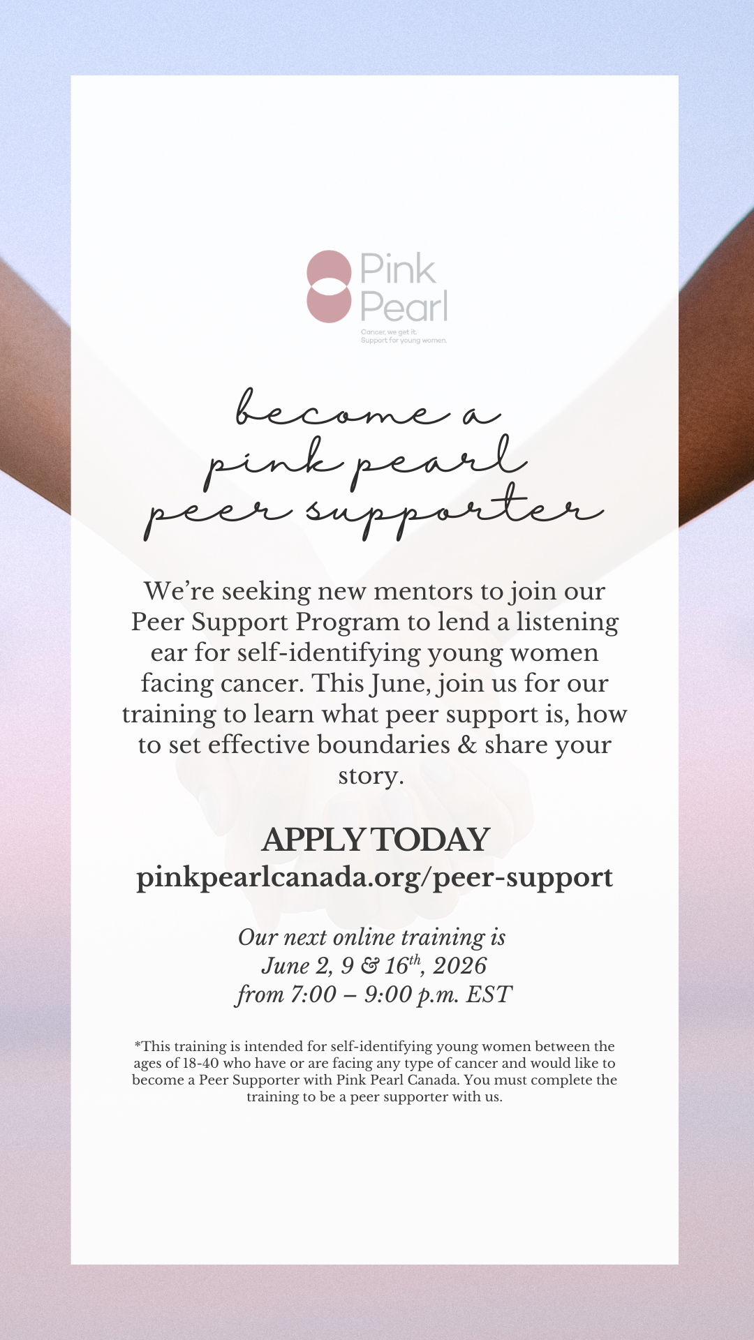 We’re seeking new mentors to join our Peer Support Program to lend a listening ear for self-identifying young women facing cancer. This June, join us for our training to learn what peer support is, how to set effective boundaries & share your story.APPLY TODAY: pinkpearlcanada.org/peer-supportOur next online training is June 2, 9 & 16th, 2026 from 7:00 – 9:00 p.m. EST