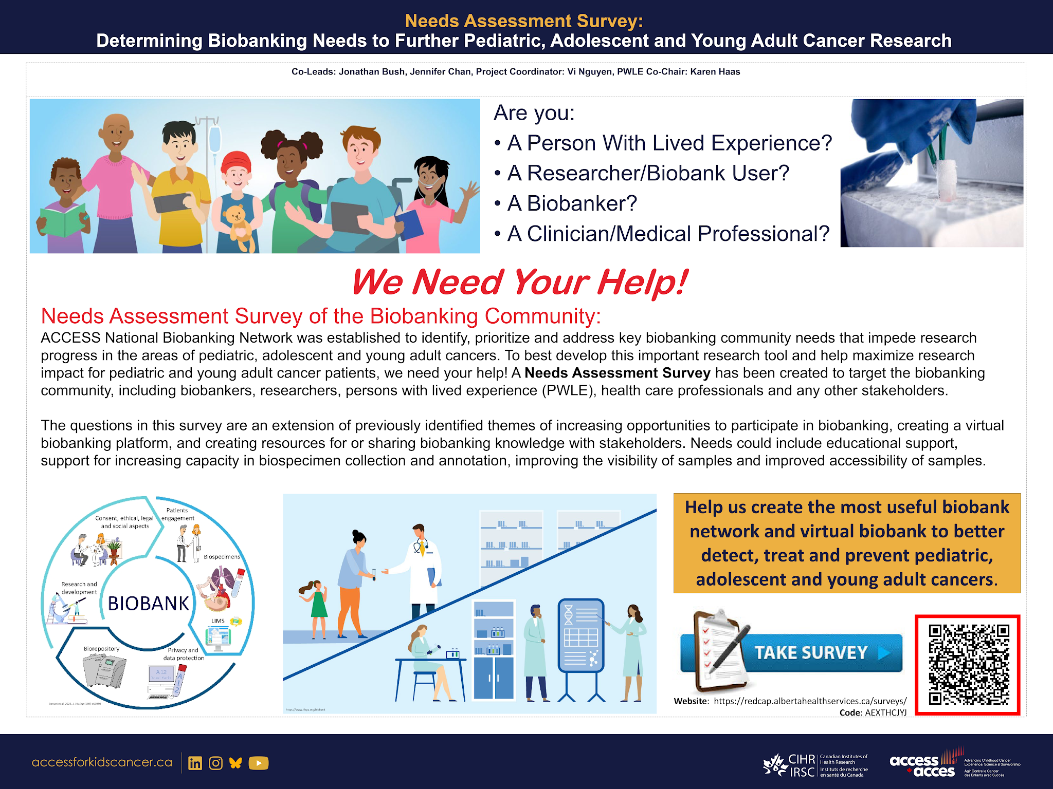 I’m reaching out from ACCESS about the National Biobanking Network, an initiative aiming to accelerate CAYA cancer research in collaboration with the biobanking community across Canada. The Biobanking Network team have launched a needs assessment survey for biobankers, researchers, persons with lived experience (PWLE), healthcare professionals, and other stakeholders to identify priorities and gaps. It focuses on expanding participation, developing a virtual biobanking platform, and improving resources, education, sample visibility, accessibility, and capacity for biospecimen collection and annotation. Input from the survey will help inform the Biobanking Network’s activities and deliverables.