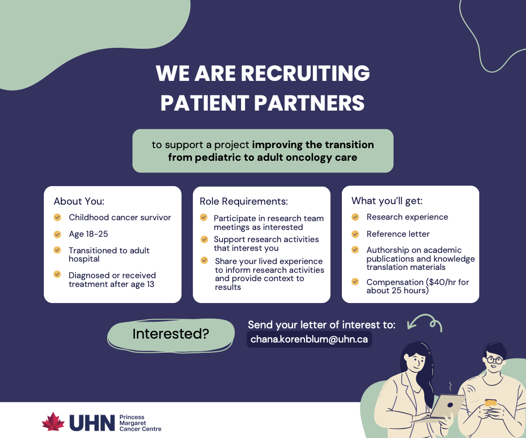 Researchers at Princess Margaret Cancer Centre are looking for patient partners ages 18-25 who were diagnosed between the ages of 13-18 or transitioned to adult care while receiving active treatment. Partners will be engaged to support a project aimed at improving the transition to adult care for adolescents. Partners will be compensated for their time and will be a key voice in shaping the direction and outcome of the project.