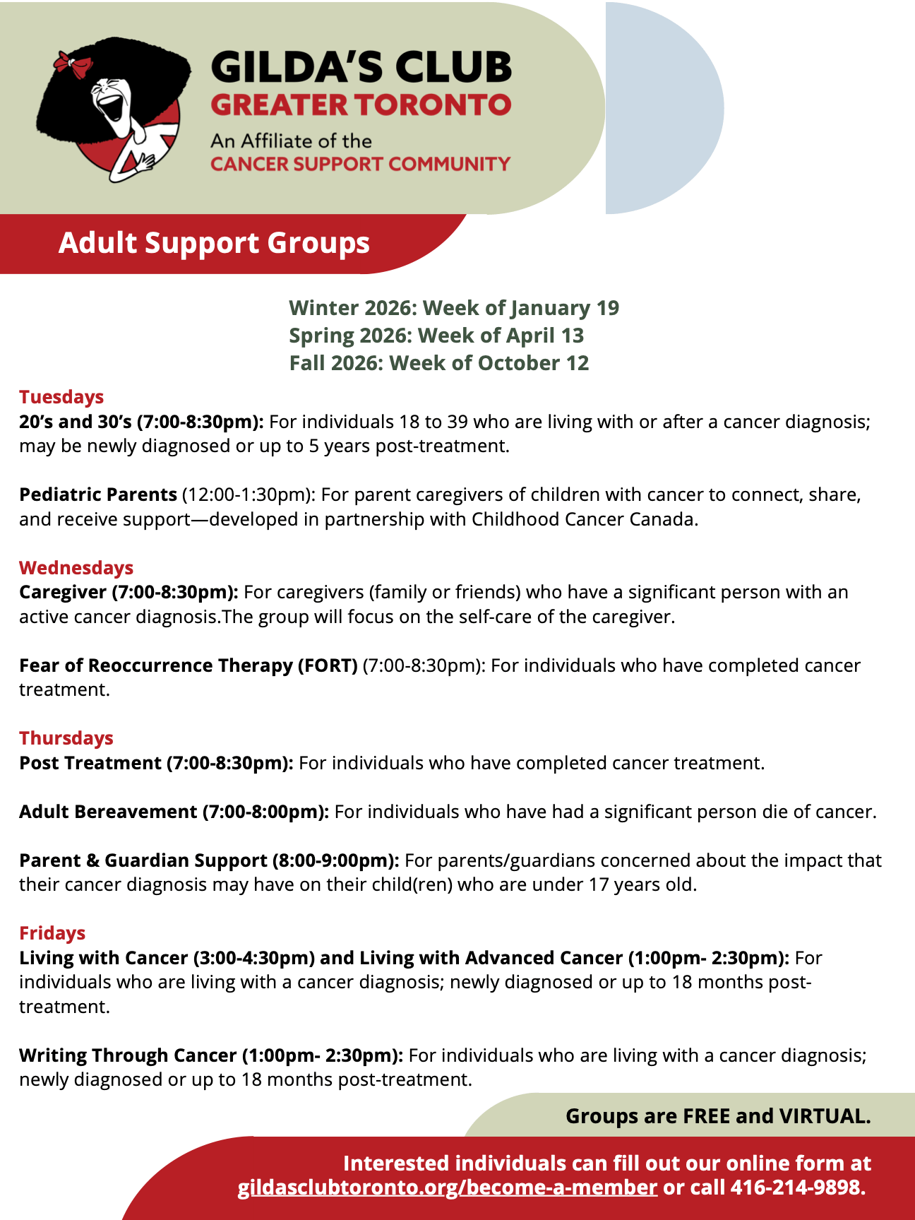 - Winter Support Groups will start the week of January 19, 2026. We are now welcoming referrals for children, youth, and adult support groups. Please see the flyers for specific group details. To access Gilda’s support groups, please complete our membership form here: Become a Member – Gilda’s Toronto