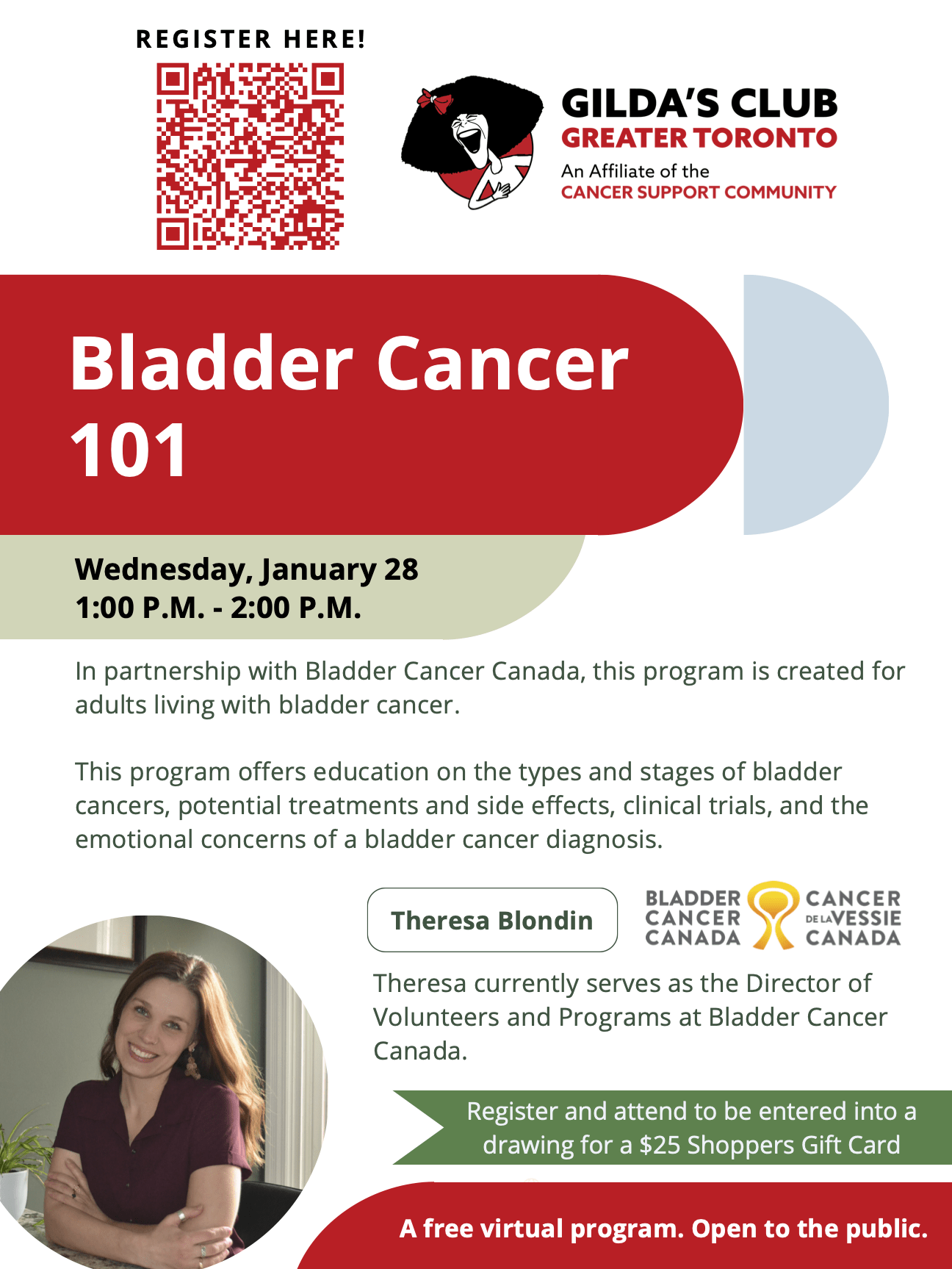 - Bladder Cancer 101: In partnership with Bladder Cancer Canada, Theresa Blondin will be facilitating a free (virtual) Education Session with Gilda’s Toronto on Wednesday, January 28th at 1 PM.
